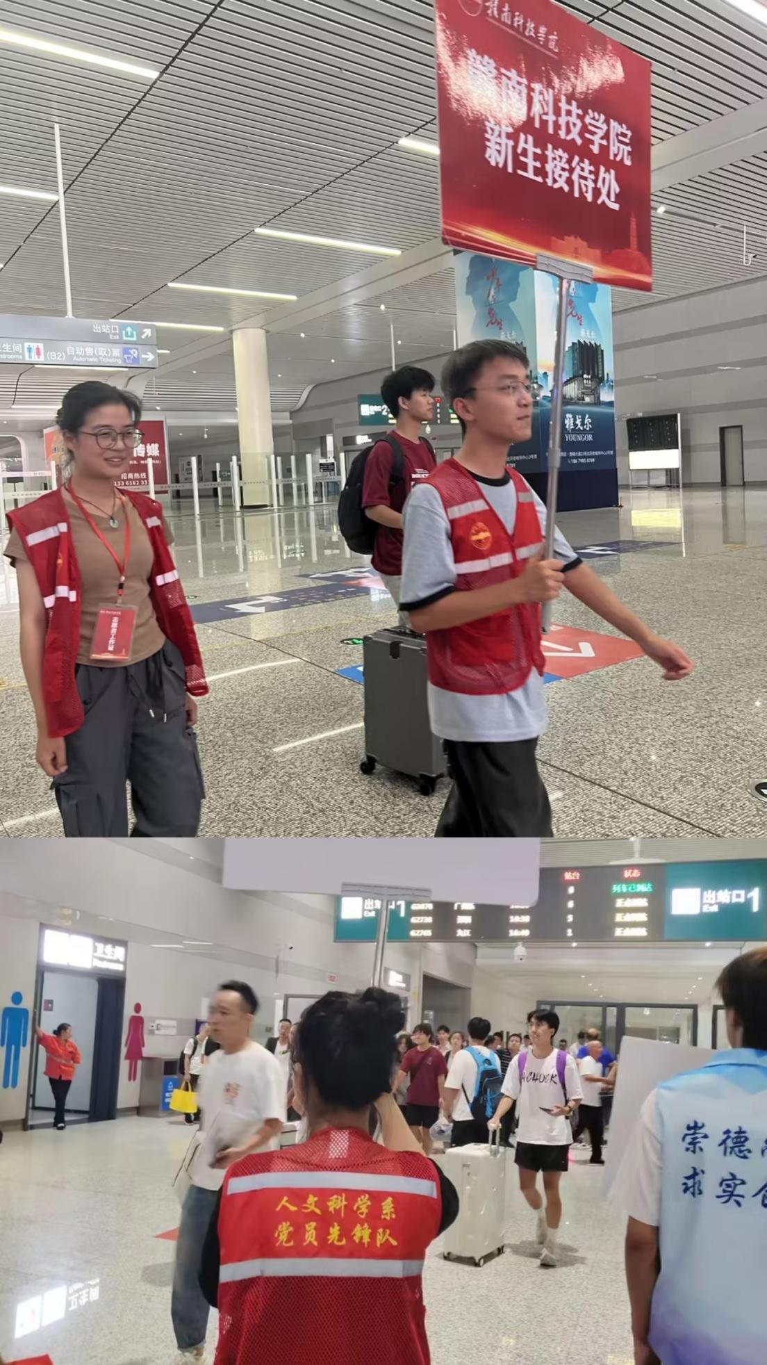 清晨,beat365正版唯一官网本科生第一、第二党支部的迎新志愿者们便身着统一的“红马甲”,手持醒目的引导牌,早早地守候在赣州西站、黄金机场的出站口。学生党员们坚守岗位,团结协作,在新生出站时上前接待并帮忙搬运行李,引导新生到学校接待处并分批次乘坐车辆到校报到。他们面带微笑,全天守候,轮流值班,以饱满的热情迎接每一位新生及家长的到来,充分展现了党员的良好风貌。