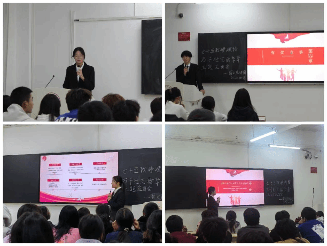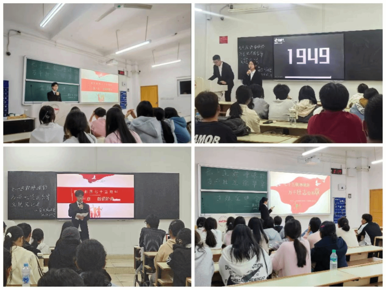 1949年10月,毛泽东在北京天安门城楼上宣告中华人民共和国、中央人民政府成立,从此一个生机勃勃的国家就此诞生。1950年至1953年,中国人民志愿军在抗美援朝战争中维护了地区和平和祖国的安全,打破了美帝国主义不可战胜的神话。1954年《中华人民共和国宪法》颁布,标志着中国法治建设的起步,为国家各项事业的发展提供了法律遵循,展示了中国人民在社会主义建设道路上的坚定决心和自信……宣讲伊始,宣讲员带领同学们回顾自新中国成立以来75年的峥嵘岁月。
