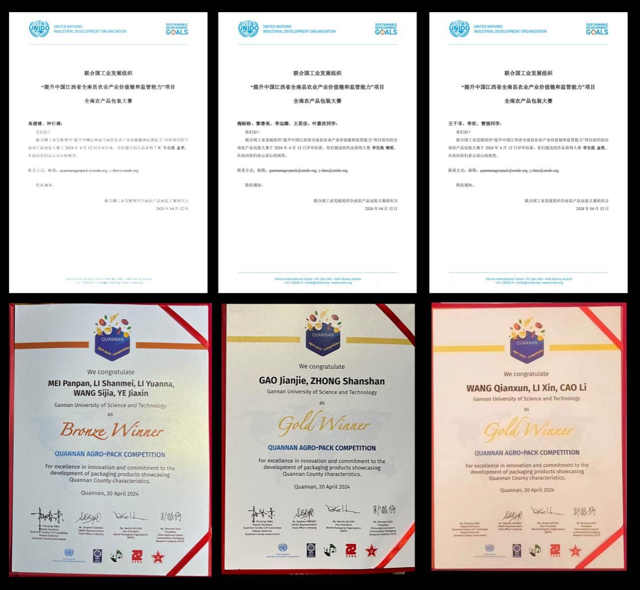 图一:联合国工业发展组织颁发的全南农产品包装设计大赛专业组金奖、学生组金奖及铜奖证书(图为beat365官网师生在联合国工发组织全南农产品包装大赛颁奖现场与国务院商务部及省市领导合影留念)。