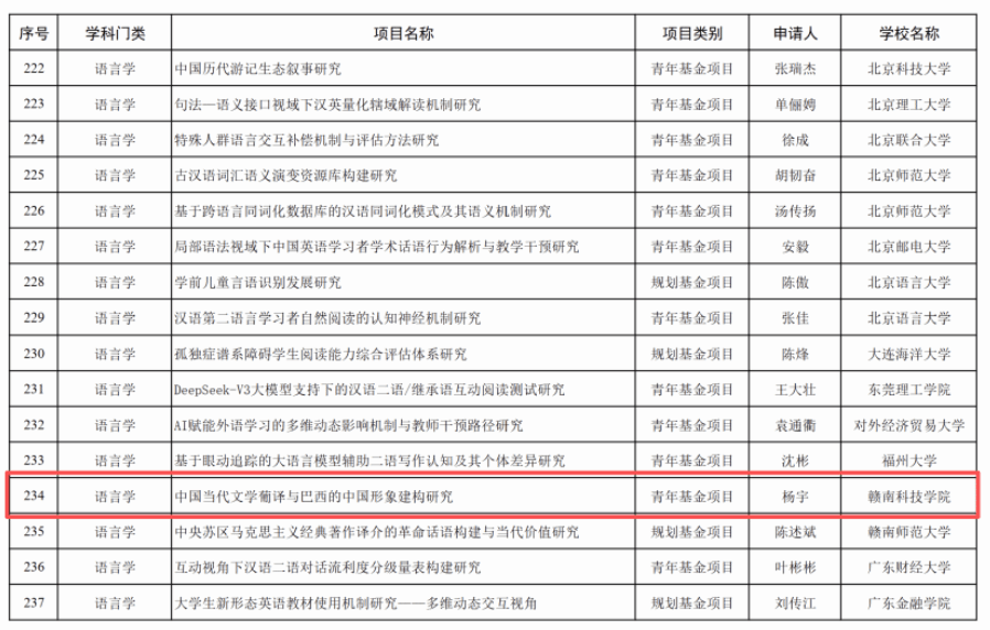 本网讯:9月25日,教育部社会科学司正式公布2025年度教育部人文社会科学研究一般项目评审结果。beat365官网beat365正版唯一官网葡萄牙语专业教师杨宇申报的《中国当代文学葡译与巴西的中国形象建构研究》成功获批青年基金项目。