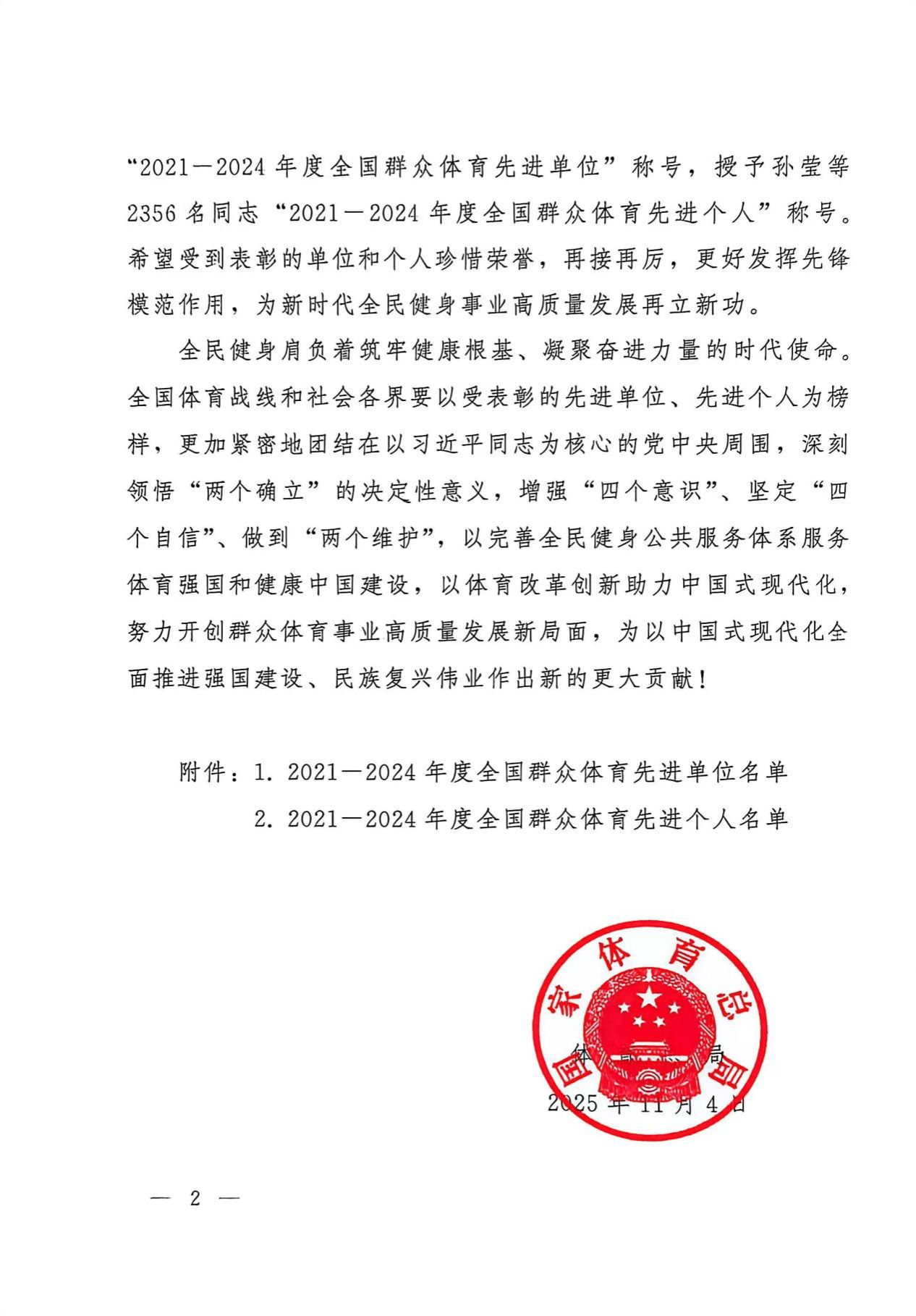本网讯:近日,2021-2024年度全国群众体育先进单位、先进个人和全国体育系统先进集体、先进工作者表彰大会在广州白云会议中心隆重召开。beat365正版唯一官网荣获“全国群众体育先进单位”荣誉称号,以表彰学校在推动群众体育事业发展、构建全民健身公共服务体系中的突出贡献,是继2001-2004年度再次获此殊荣。