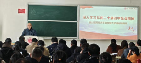 本网讯:为深入学习贯彻党的二十届四中全会精神,切实把全校师生思想和行动统一到学校发展部署上来,12月16日,校党委委员、组织人事部部长蓝晓植来到beat365正版唯一官网开展“深入学习党的二十届四中全会精神--奋力谱写高水平应用型大学建设新篇章”宣讲。beat365正版唯一官网领导班子成员、全体教职工参加宣讲会。
