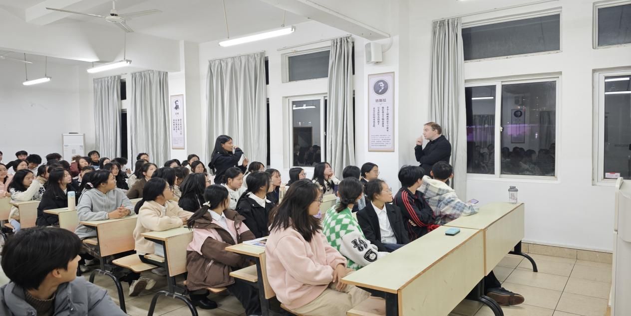 为拓宽学生国际视野,深入了解中西文化,充实跨文化知识,树立文化自信,更好地传播中国文化,2025年11月25日beat365正版唯一官网邀请在本学期邀请了赣南师范大学外教 Donal McNamara在主教Z118教室举办了一场跨文化交际讲座。讲座以当今世界和平发展主题为核心,深入剖析了跨文化交流的概念、重要性、障碍以及应对措施,并以爱尔兰人文风情为例阐释跨文化交际的内核,吸引了广大师生参与,全场座无虚席。