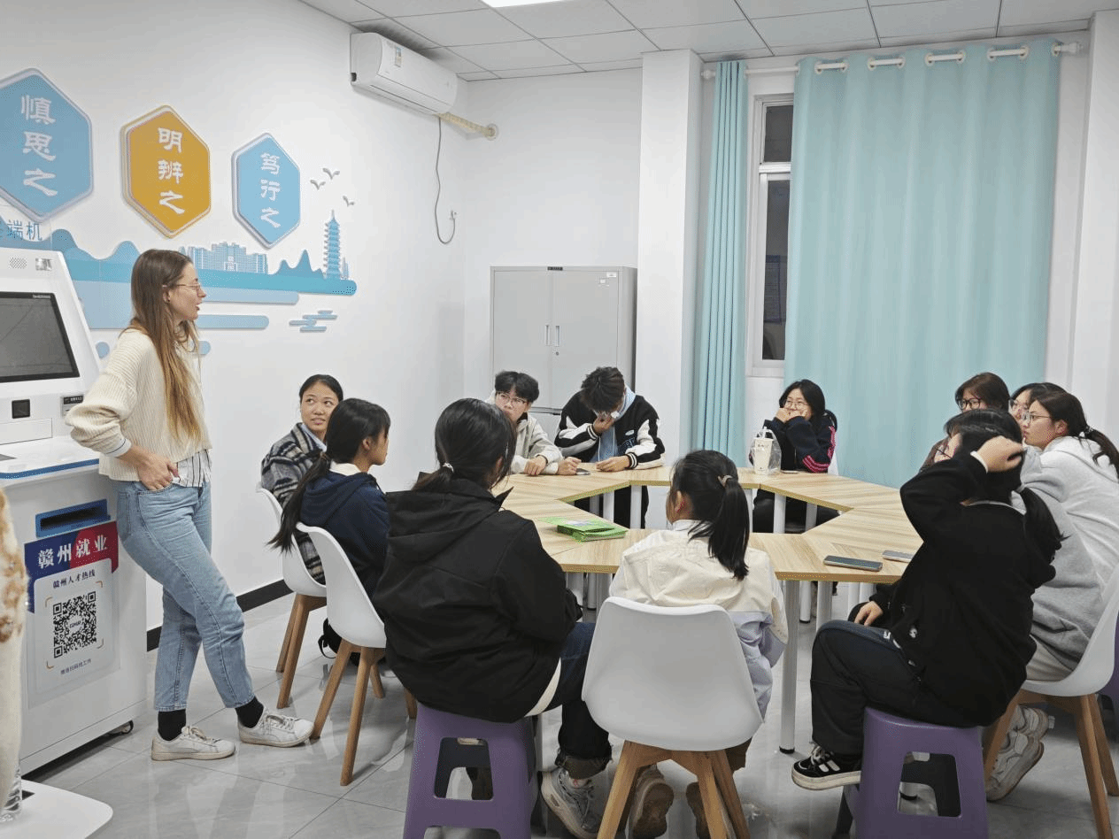三位外教和学生们进行自我介绍,并进入自由交流环节,话题涵盖家乡特色、个人兴趣、梦想职业、旅行见闻等。外教全程悉心指导、纠正发音,分享地道表达和个人经验。同学们踊跃发言分享,现场气氛活跃欢乐,掌声不断。