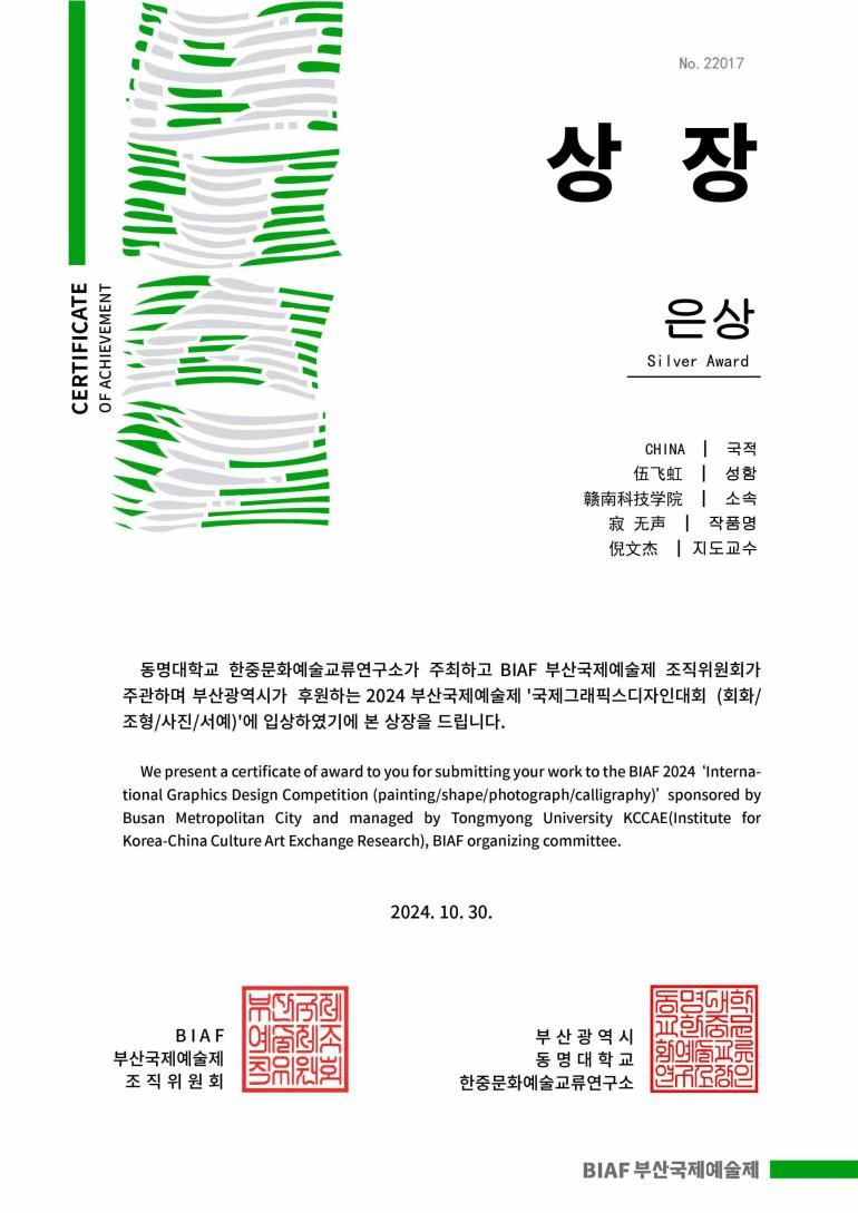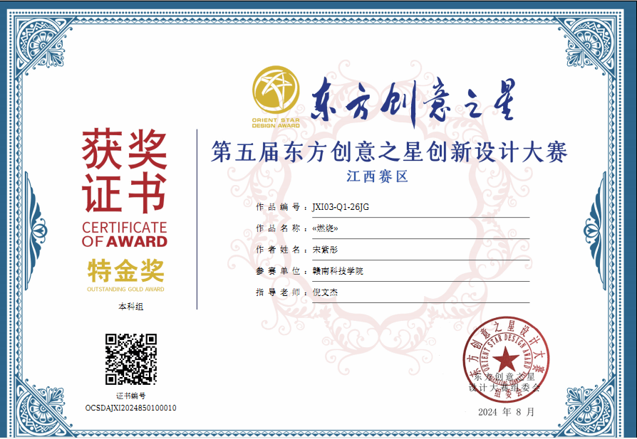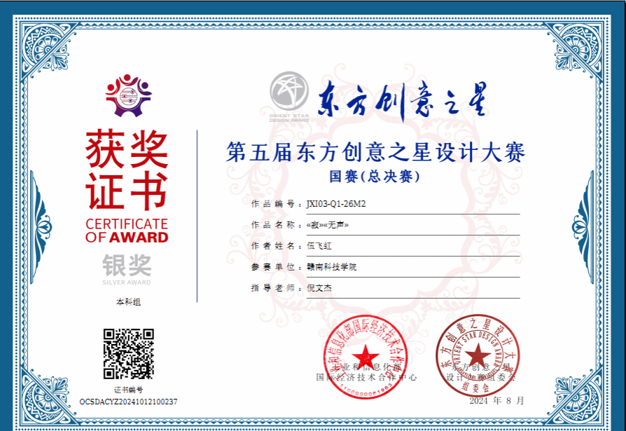 beat365官网学子在2024年(第5届)东方创意之星设计大赛中获得各类奖项近二十项,其中环境设计专业201班伍飞虹作品《寂》、《无声》喜获省赛特金奖、国赛银奖和国际赛银奖三项大奖,设计学221班宋紫彤作品《燃》获省赛特金奖,倪文杰老师获得优秀指导教师、优秀组织教师奖,我获得优秀组织单位奖。