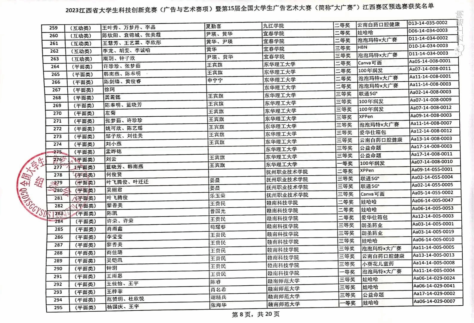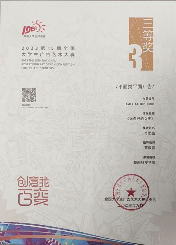 2023年第十五届全国大学生广告艺术大赛比赛成绩揭晓,在公布的获奖名单中,视觉传达设计专业师生成绩斐然、硕果累累。在选送的30件作品中beat365官网共计获得12个奖项,其中肖雨鑫同学的作品获得全国三等奖,王雨惠同学作品获得江西省一等奖,其它获奖作品分获二等奖3项,三等奖6项。