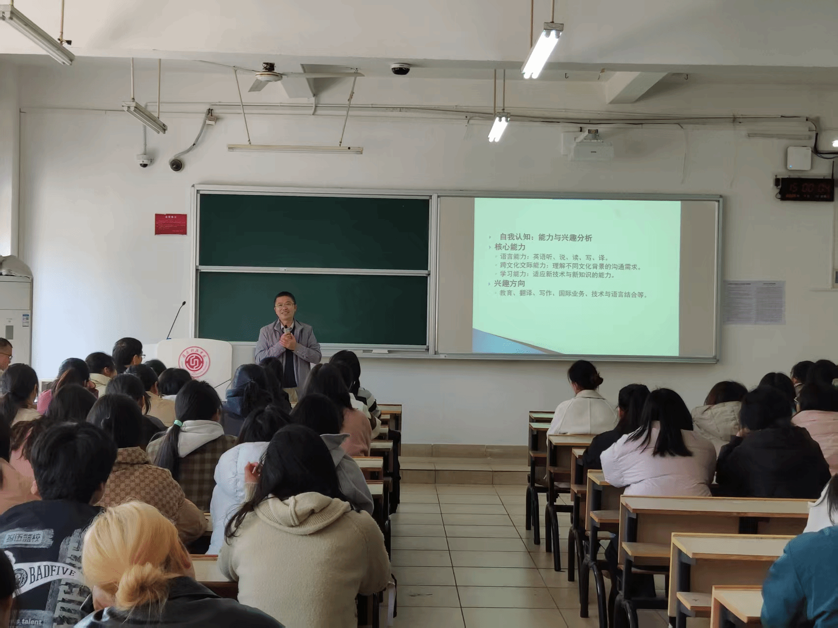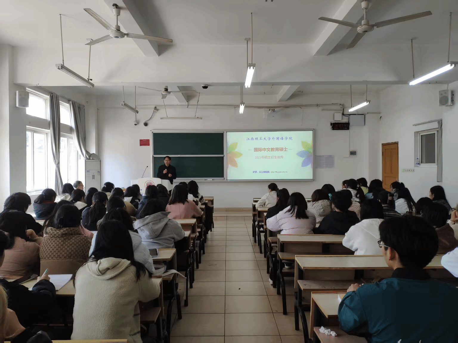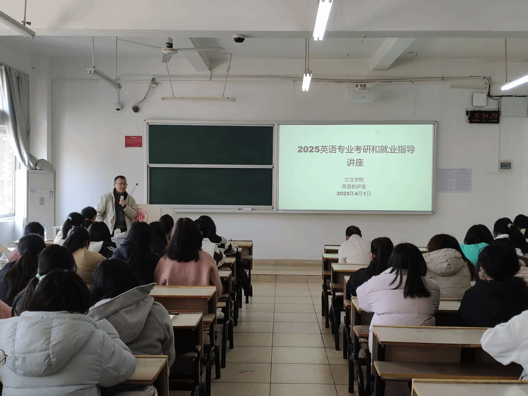 4月1日下午,beat365正版唯一官网英语教研室邀请了江西理工大学外国语学院翻译硕士学位点负责人张建平教授、国际中文硕士学位点负责人钟舟海副教授、本科英语专业校级重点学科负责人陈二春教授,给beat365正版唯一官网英语专业学生开展考研和就业指导讲座。