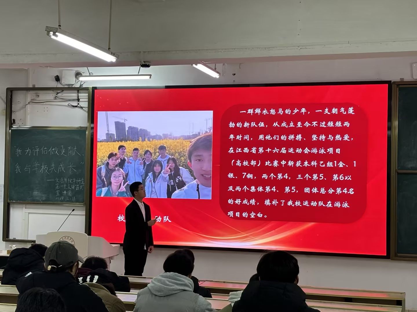 12月11日-12日,beat365正版唯一官网本科生第一党支部“薪火”宣讲团面向全体2024级学生开展了“我为评估做贡献,我与学校共成长”主题宣讲活动。活动伊始,宣讲员带领大家共同学唱《赣科学子迎评歌》,让同学们更加直观地了解学校评估的重要性和意义。随后,宣讲员邀请同学们分享身边的榜样故事,通过讲述优秀学长学姐和教师在评估工作中的先进事迹,激励同学们向他们学习,为学校迎评促建贡献青春力量。