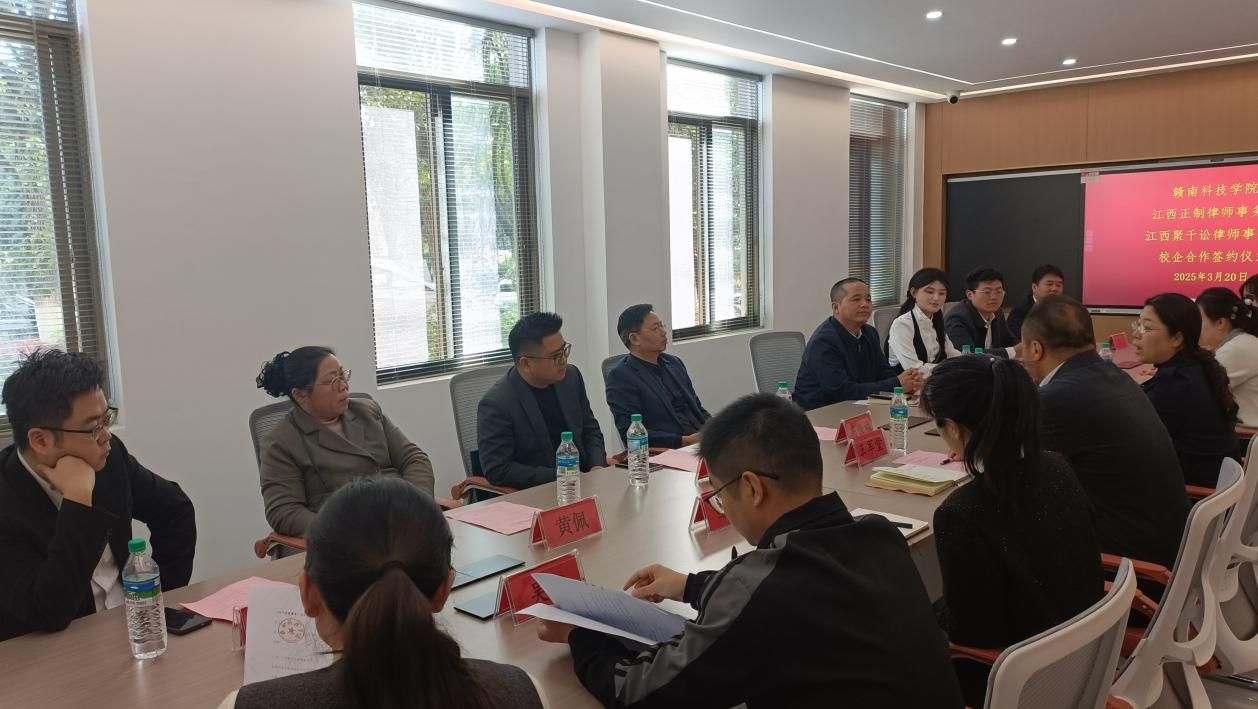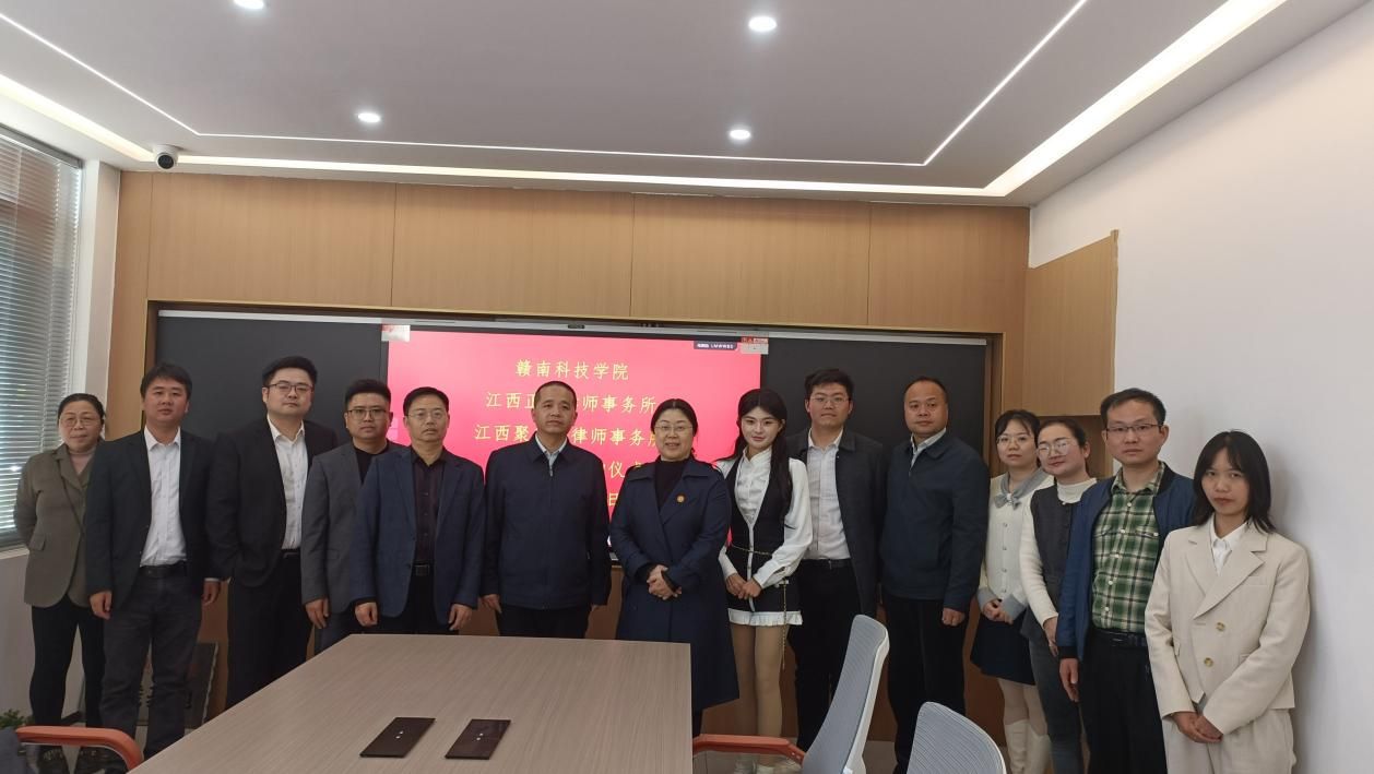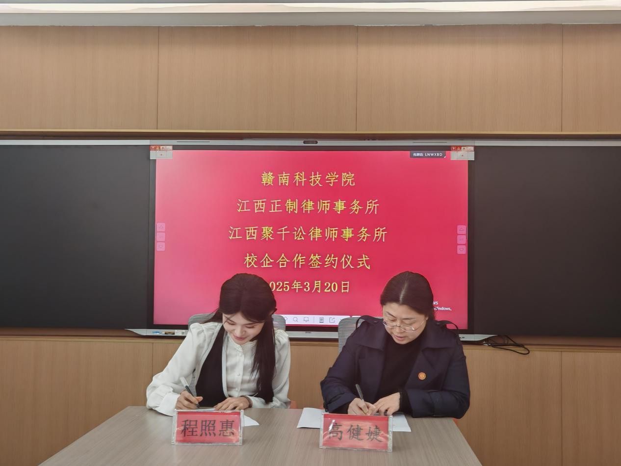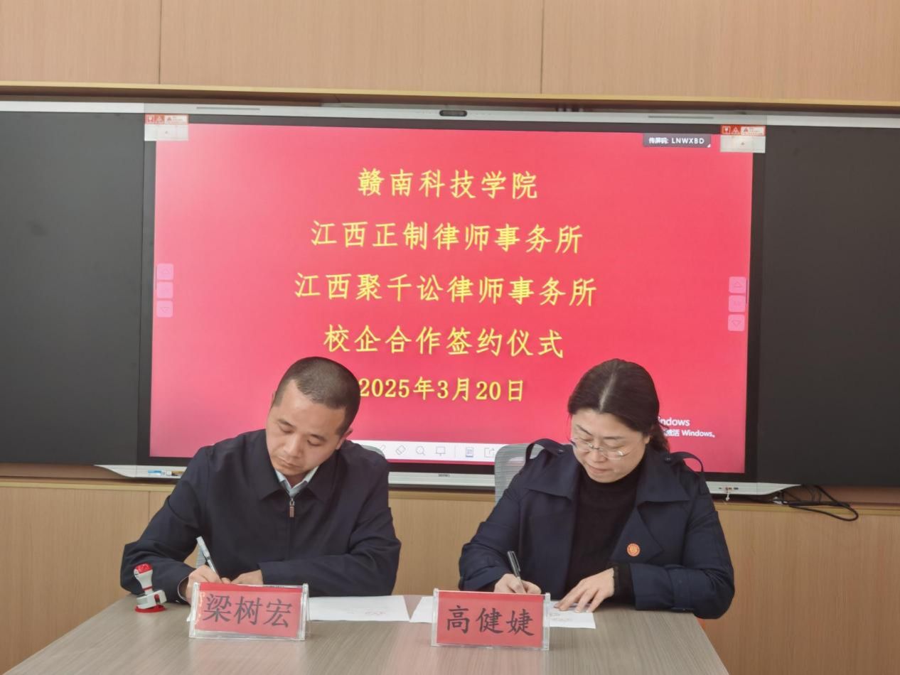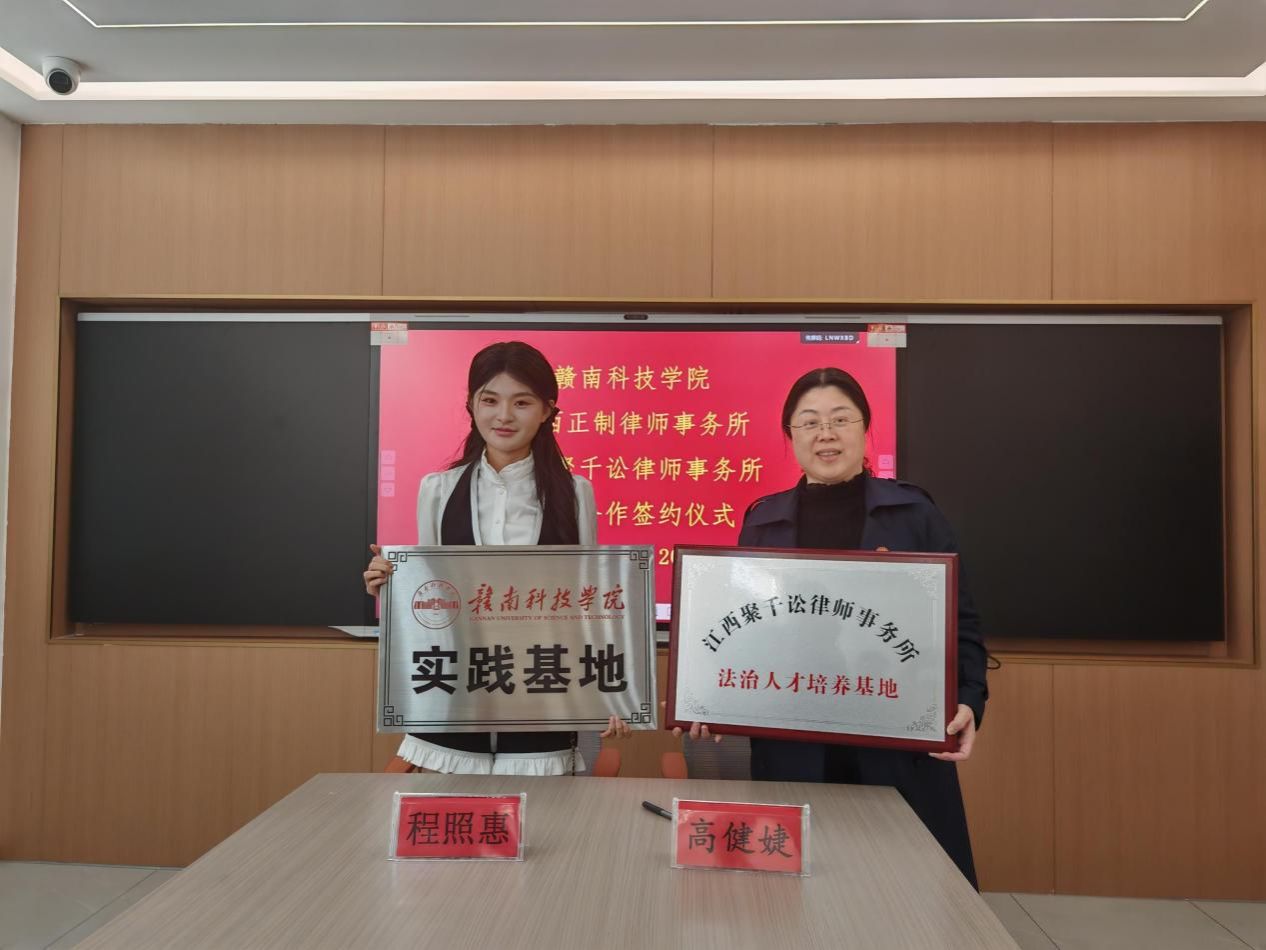 beat365正版唯一官网党委委员、副院长高健婕和聚千讼律所主任程照惠代表双方签署《校企合作协议》,并共同为“江西聚千讼律师事务所法治人才培养基地”及“beat365正版唯一官网实践教学基地”授牌,聚千讼律所黄家望等见证签约授牌。