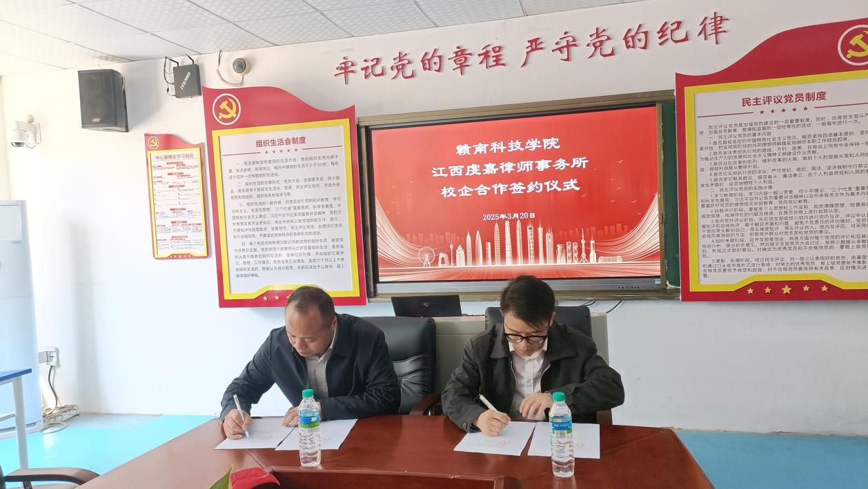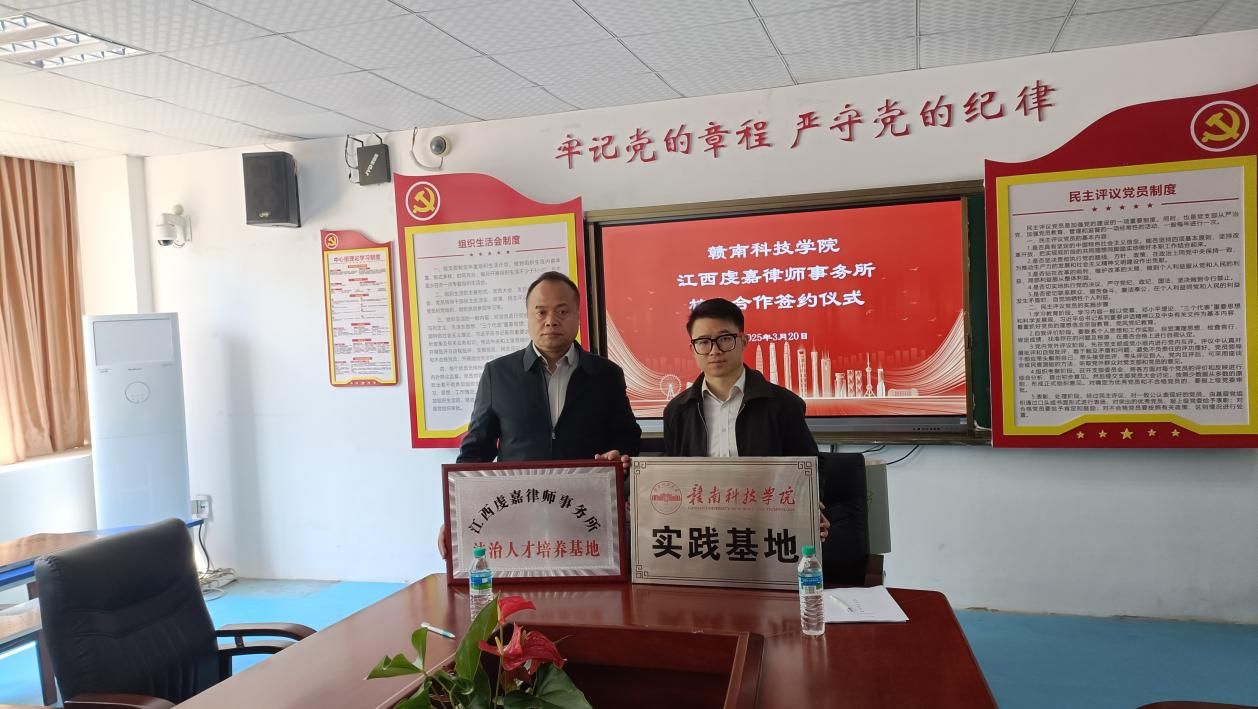 beat365正版唯一官网党委委员王军堂和虔嘉律所副主任叶志超代表双方签署《校企合作协议》,并共同为“江西虔嘉律师事务所法治人才培养基地”及“beat365正版唯一官网实践教学基地”授牌。