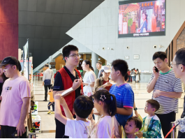 除了在游戏区域提供服务,志愿者们还积极参与到五四青年节特别环节的组织工作中。他们协助工作人员准备制作“五四”油墨海报的材料和工具,引导完成四个项目的游客有序参与到海报制作中,为游客们讲解五四运动的历史背景和意义,让大家在欢乐游戏的同时,接受爱国主义教育。