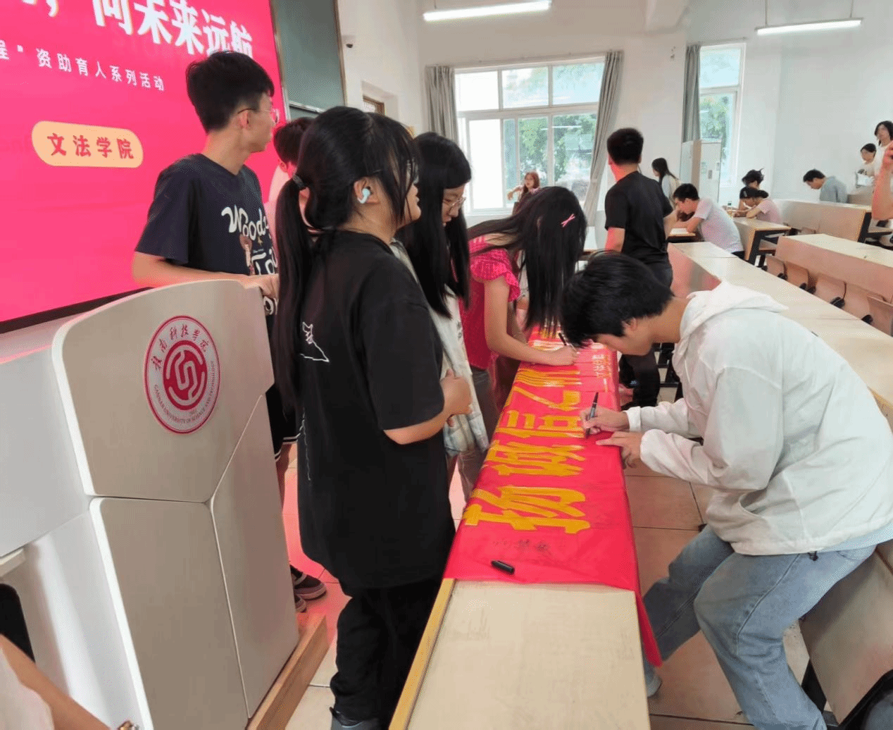 在宣讲结束后,现场同学有序来到印有“扬诚信之帆,向未来远航”的横幅前,郑重签下自己的名字。横幅上的签名不仅是一份承诺,更是一份责任与担当。同学们纷纷表示,将从自身做起,从小事做起,将诚信理念融入日常学习和生活中,做诚实守信的践行者。