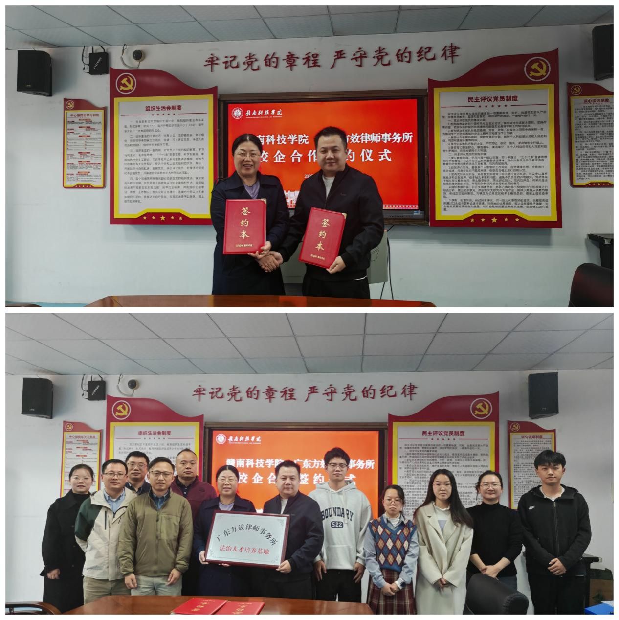 高健婕和广东方效律师事务所执行主任陈俊代表校所双方签署了《beat365正版唯一官网 广东方效律师事务所合作共建协议》,并进行了“广东方效律师事务所法治人才培养基地”与“beat365正版唯一官网实践教学基地”揭授牌。